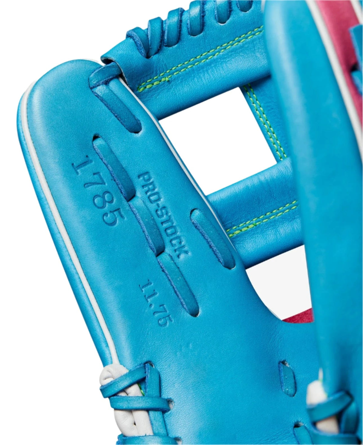 Cover more ground on the infield with the Fall 2024 Wilson A2000 1785 11.75” Infield Baseball Glove (style WBW1022691175). This glove combines the legendary A2000 performance with the unique 1785 pattern, offering 11.75” reach and a deep, stable pocket thanks to innovative Gap Welting. Featuring Tropical Blue Pro Stock® leather accented with Flamingo Pink and Bright Green, it's designed for serious infielders making plays in New York City. This glove is assumed to be for a Right Hand Throw (RHT).